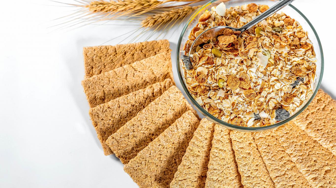 Обои Мюсли в тарелке на столе с хлебцами