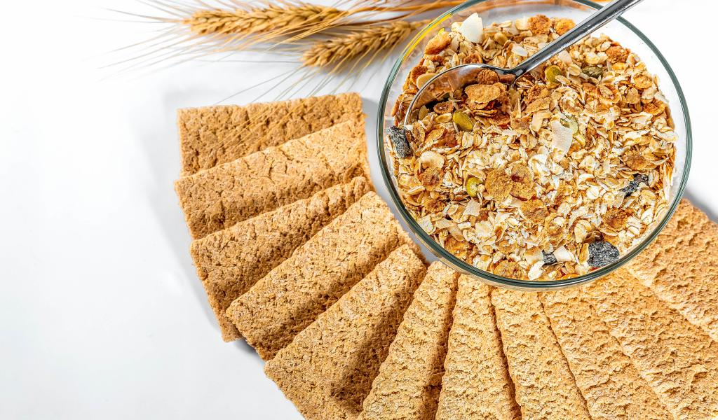 Обои Мюсли в тарелке на столе с хлебцами