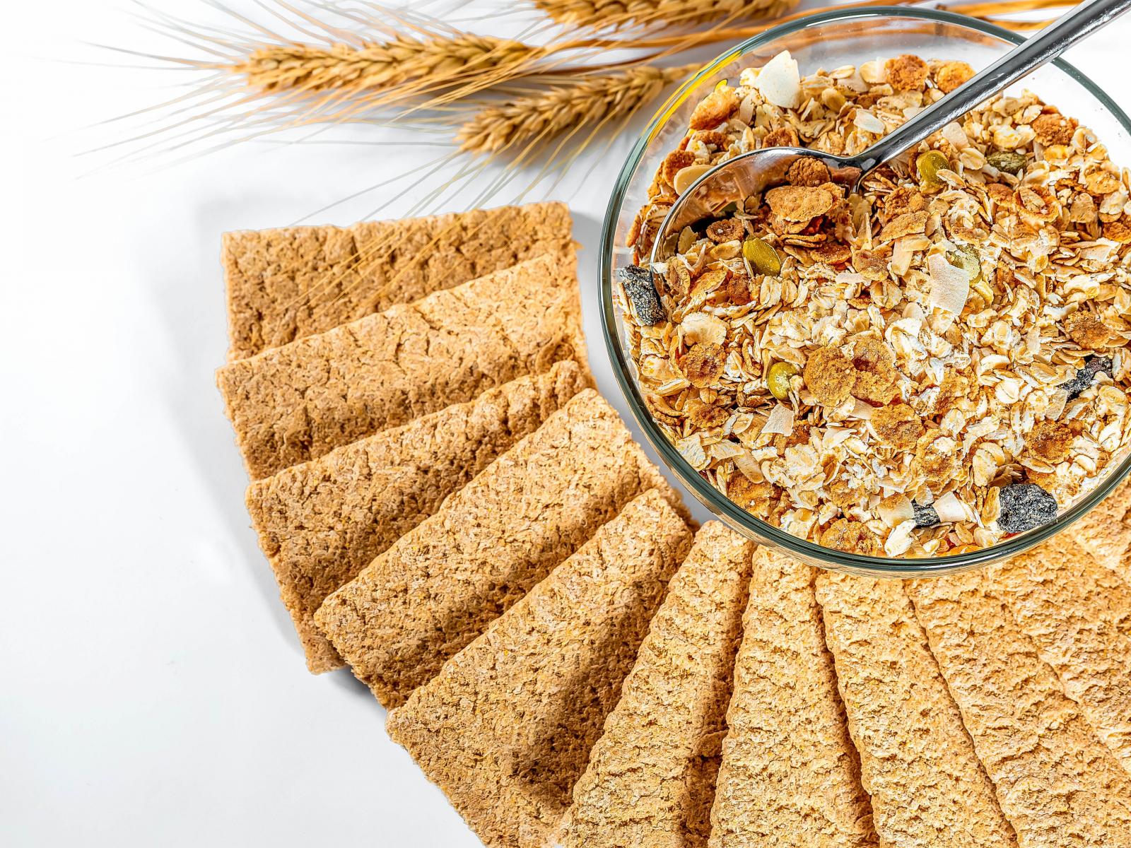 Обои Мюсли в тарелке на столе с хлебцами