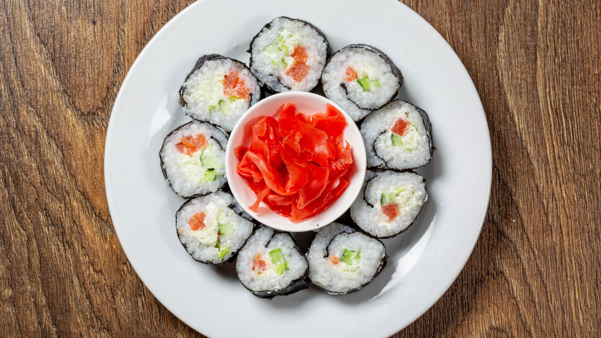 Обои Вкусные суши на большой белой тарелке с имбирем