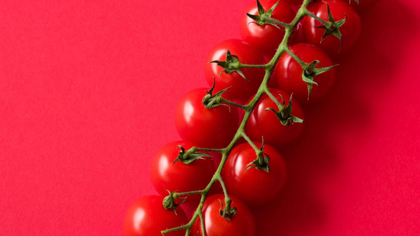 Обои Много красных спелых помидоров на розовом фоне