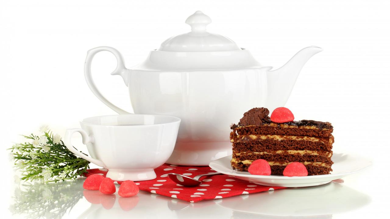 Обои Белая чашка чая и чайник на столе с куском торта