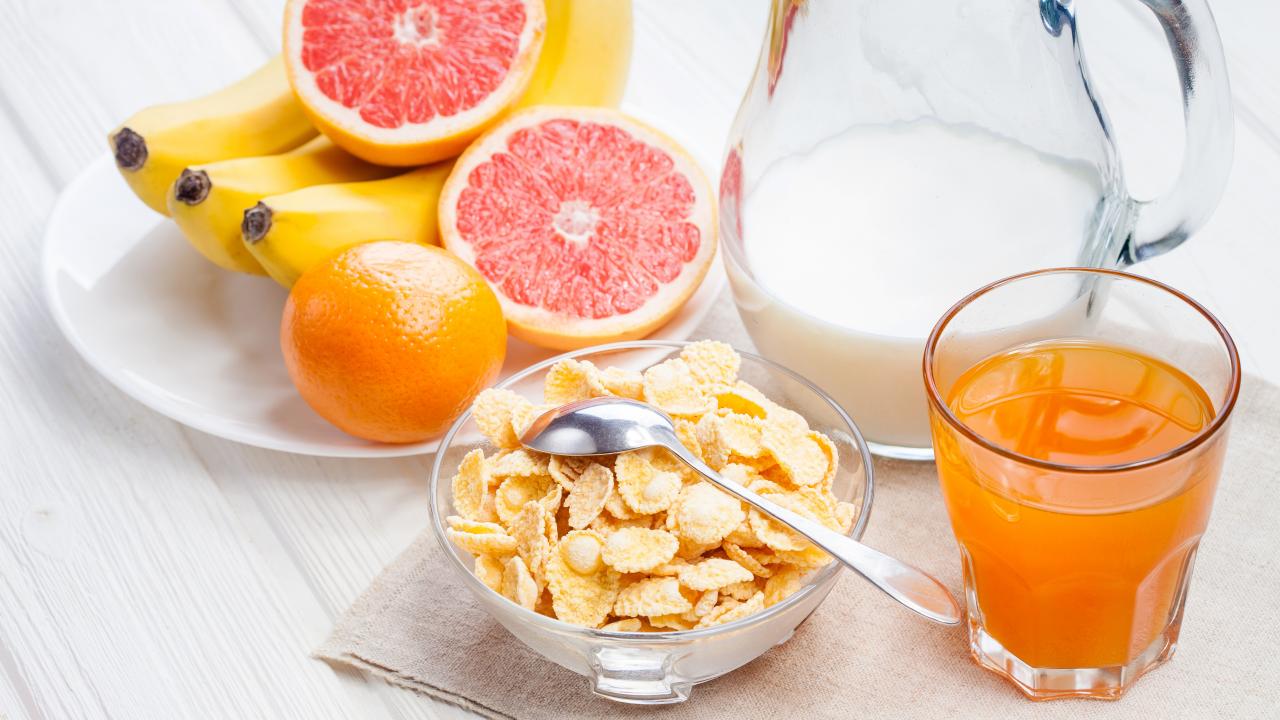 Обои Кукурузные хлопья на столе с молоком, соком и свежими фруктами на завтрак