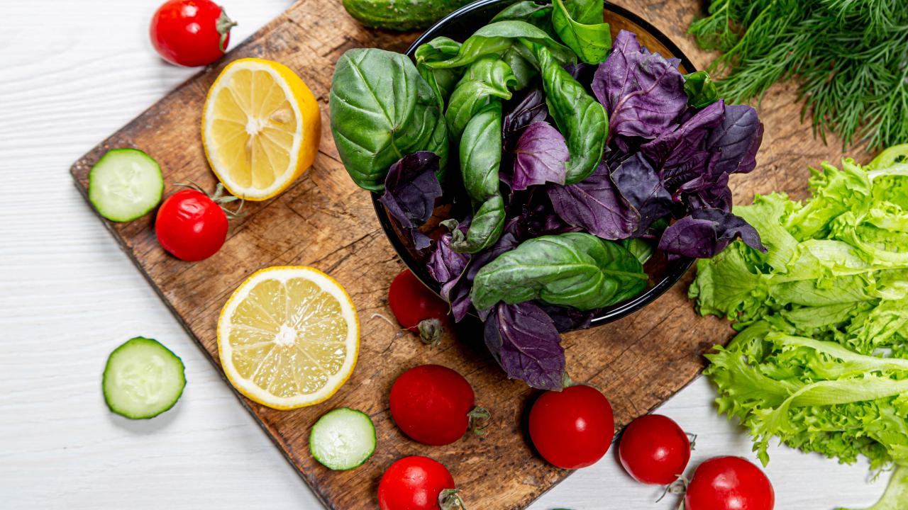 Обои Базилик на столе с зеленью, помидорами и лимоном