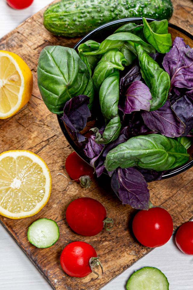 Обои Базилик на столе с зеленью, помидорами и лимоном