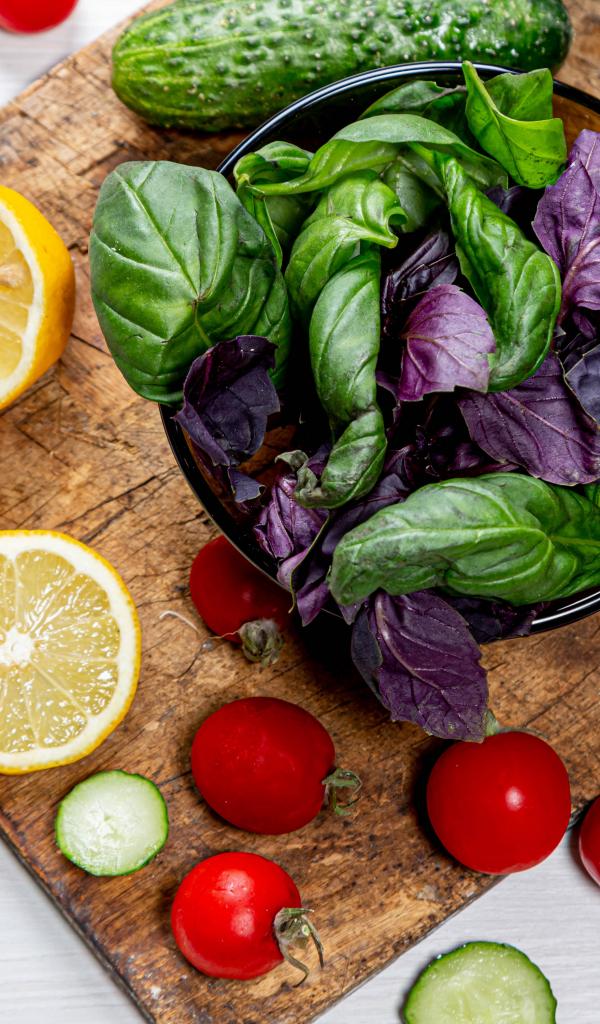 Обои Базилик на столе с зеленью, помидорами и лимоном