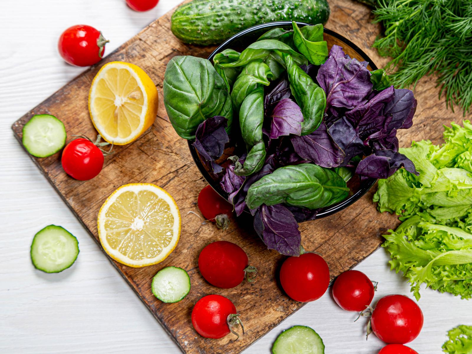 Обои Базилик на столе с зеленью, помидорами и лимоном