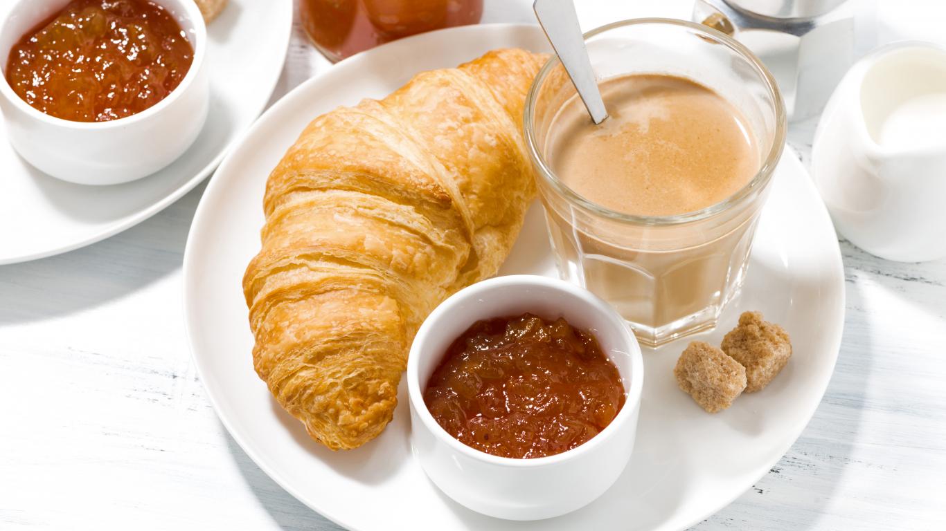 Обои Какао на тарелке с джемом и круассаном