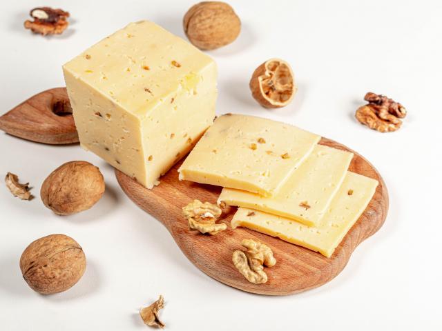 Обои Твердый сыр на доске с грецкими орехами