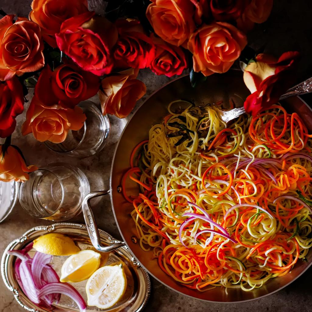 Обои Салат из овощей на столе с розами