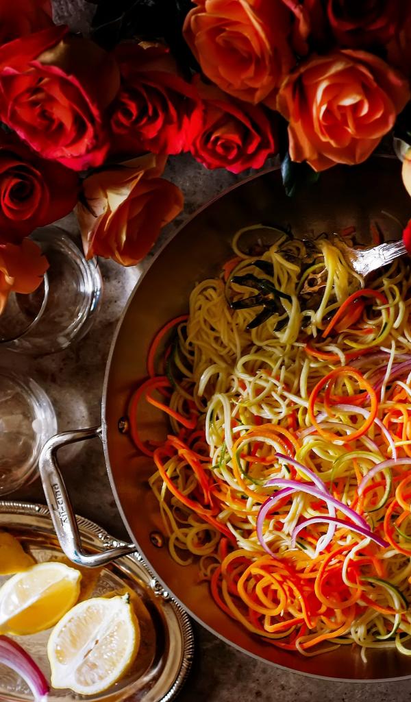 Обои Салат из овощей на столе с розами