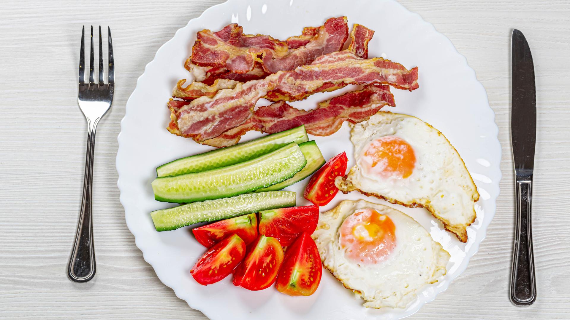 Обои Большая белая тарелка с беконом, огурцами, помидорами и яичницей