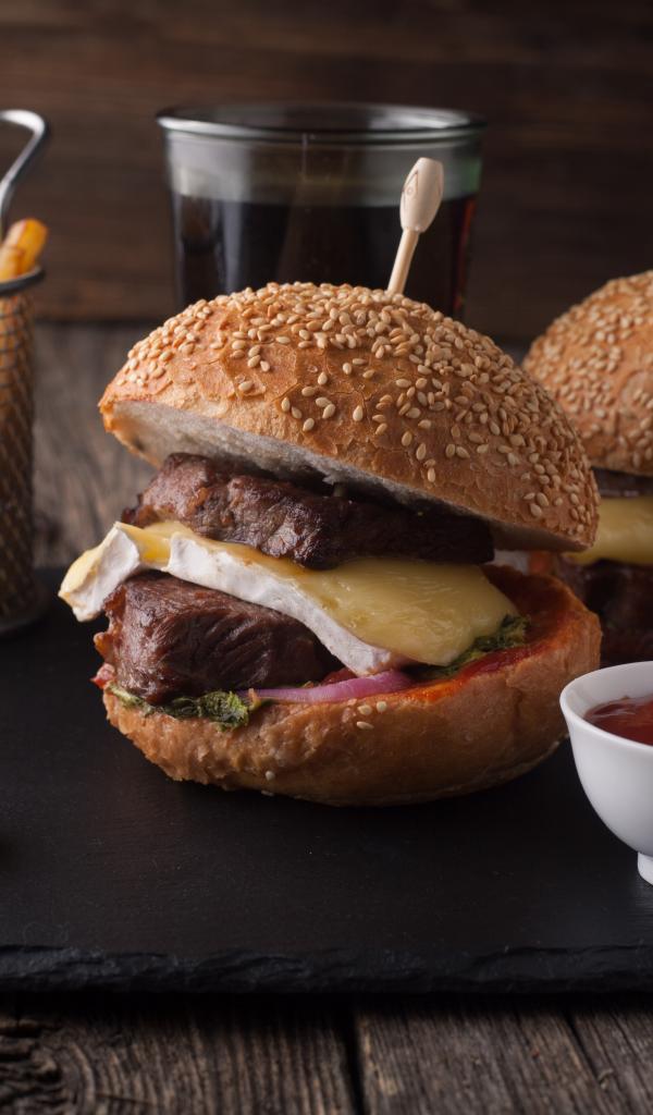 Обои Гамбургеры с мясо на столе с картофелем фри и соусом