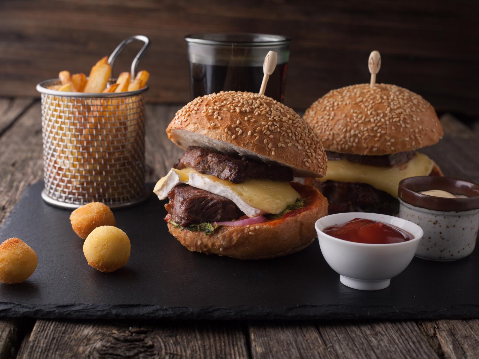 Обои Гамбургеры с мясо на столе с картофелем фри и соусом