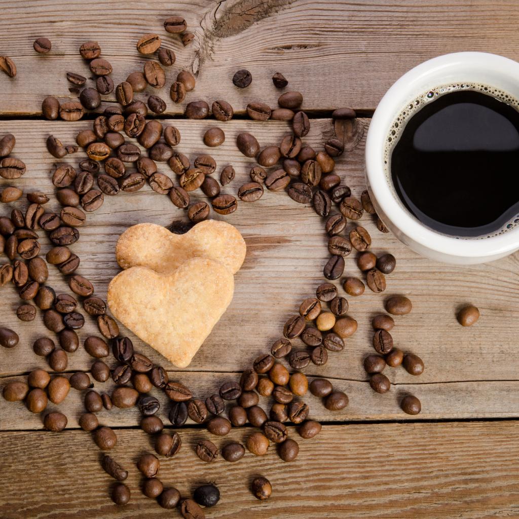 Обои Печенье в форме сердца на столе с зернами и чашкой кофе