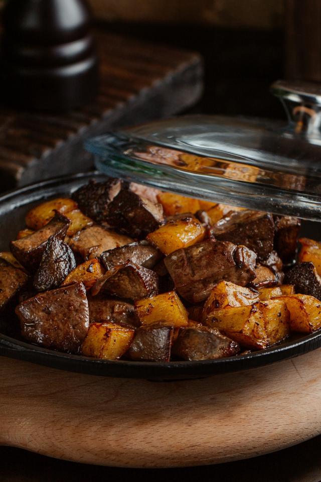 Обои Печень с картофелем в сковороде на столе