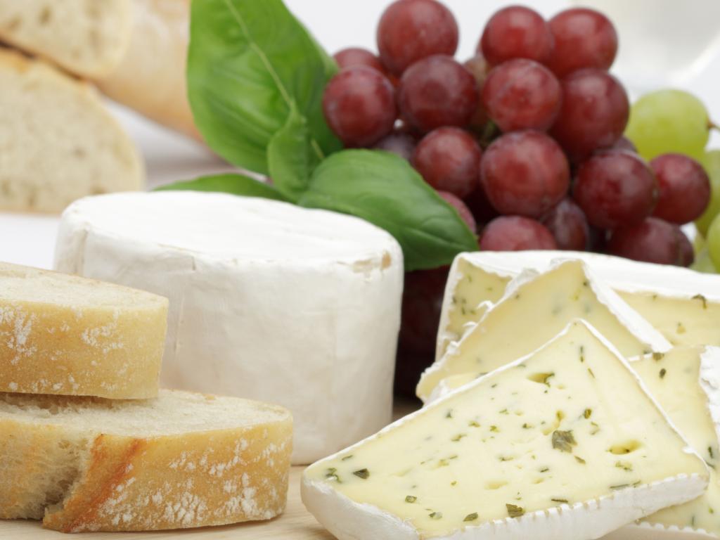 Обои Твердый сыр на столе с батоном и виноградом