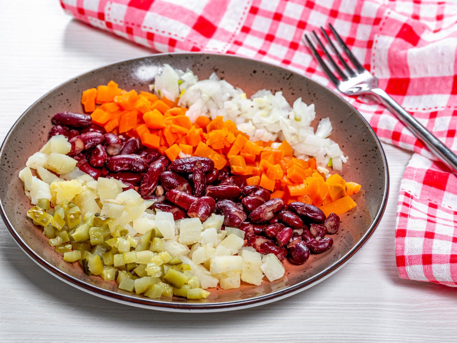 Обои Овощи и фасоль нарезанные на тарелке