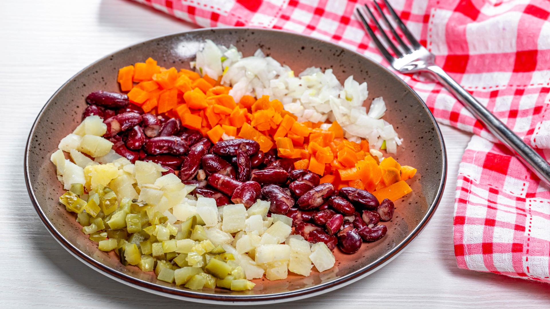 Обои Овощи и фасоль нарезанные на тарелке