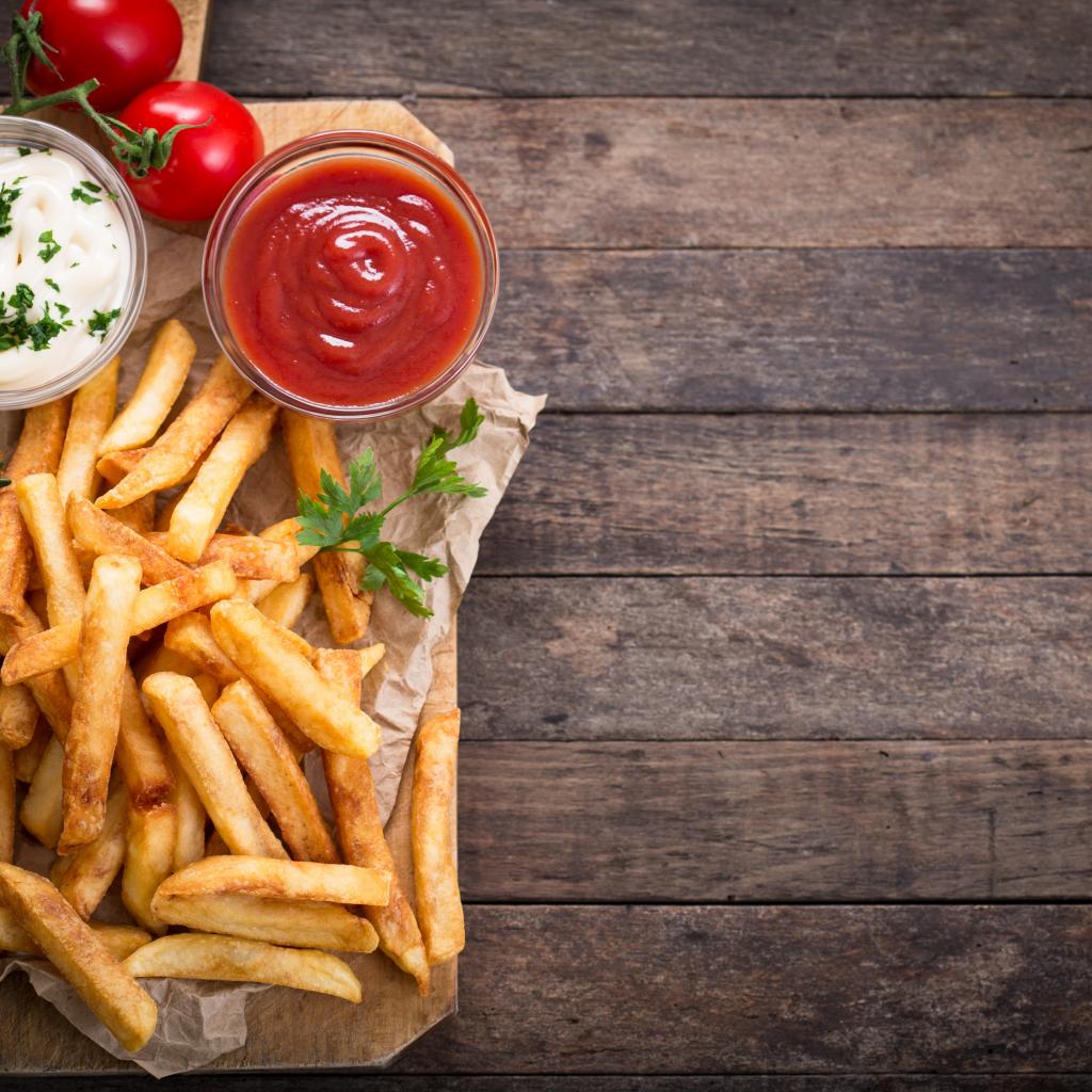 Обои Аппетитный картофель фри на столе с соусом и кетчупом