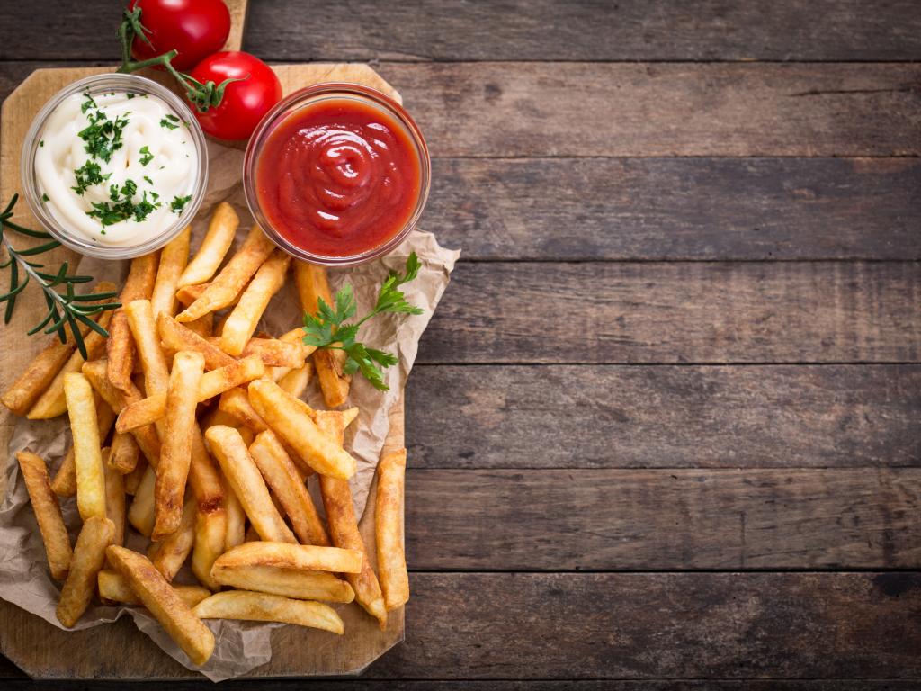 Обои Аппетитный картофель фри на столе с соусом и кетчупом
