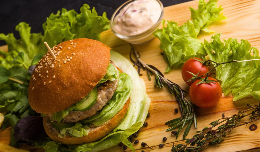 Обои Гамбургер на столе с листьями салата, специями, помидорами и соусом