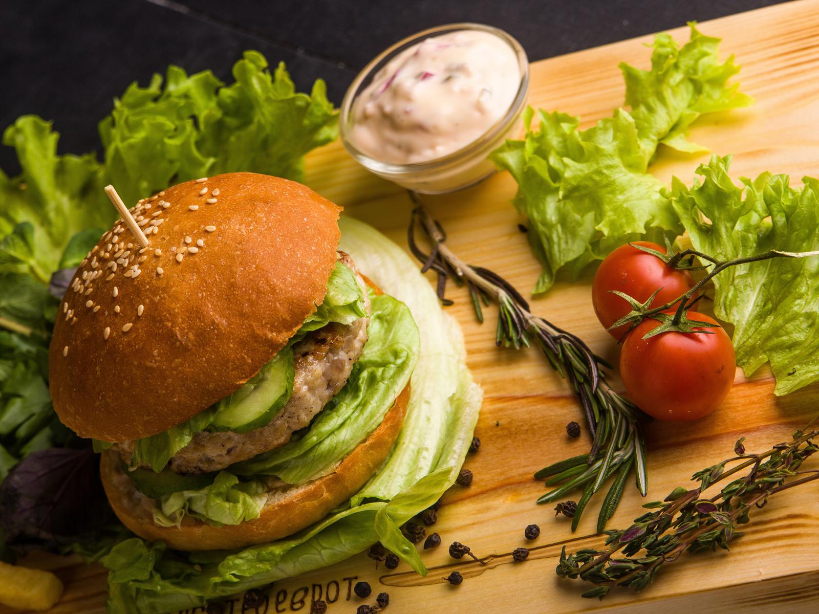 Обои Гамбургер на столе с листьями салата, специями, помидорами и соусом