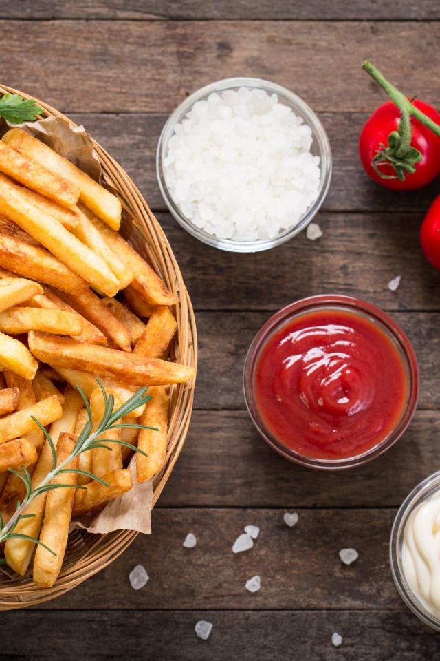 Обои Картофель фри на столе соусом, солью и помидорами
