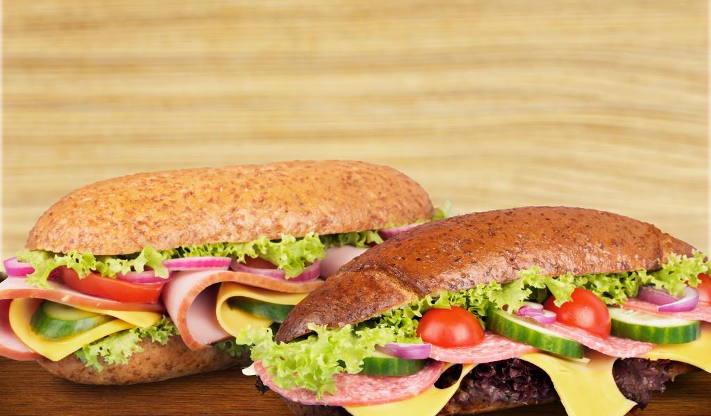 Обои Два вкусных бутерброда с овощами и колбасой на столе