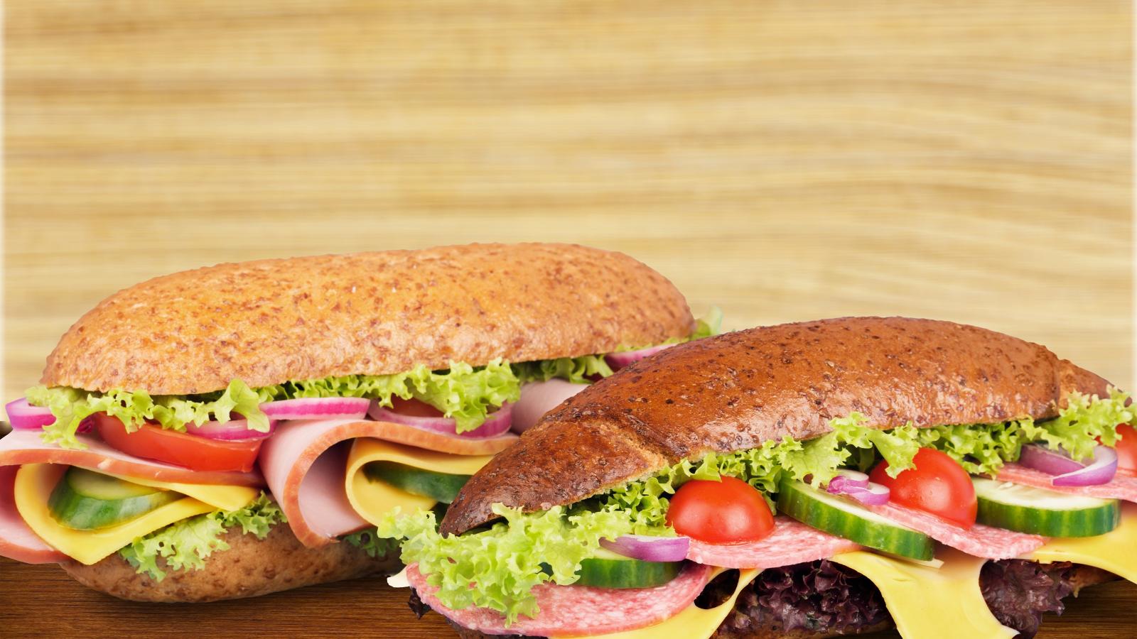 Обои Два вкусных бутерброда с овощами и колбасой на столе