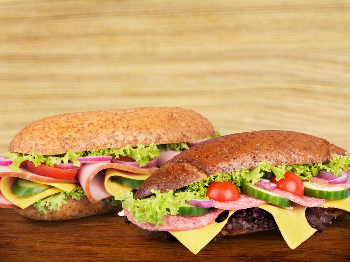 Обои Два вкусных бутерброда с овощами и колбасой на столе