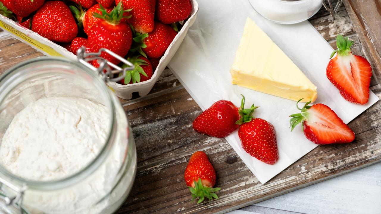 Обои Кусок масла на столе с клубникой и мукой