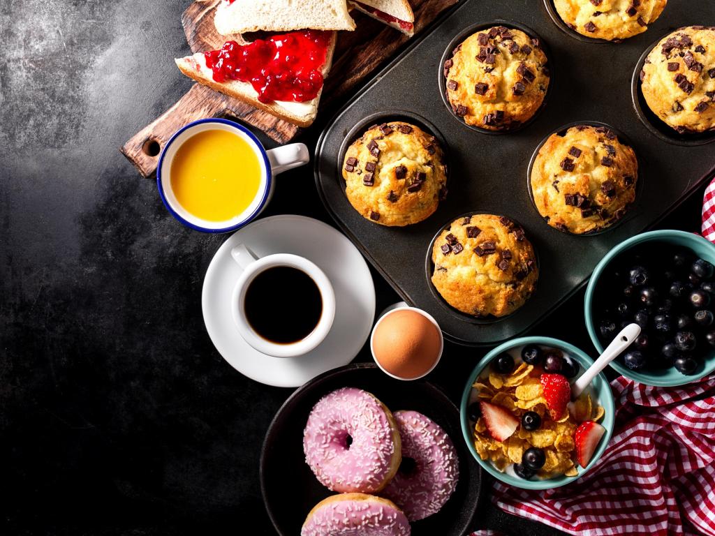 Обои Сладкая выпечка на столе с кофе и соком