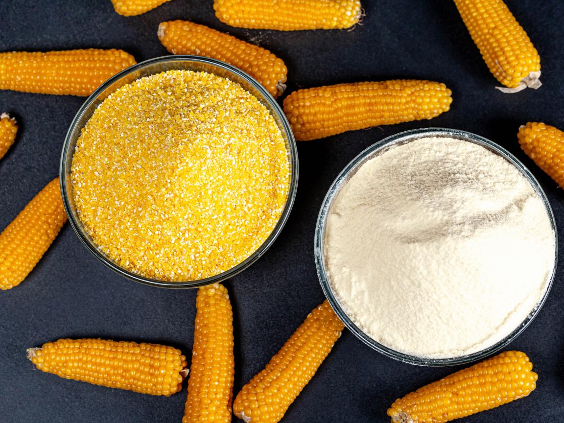 Обои Кукурузные кочаны на столе с кашей и мукой