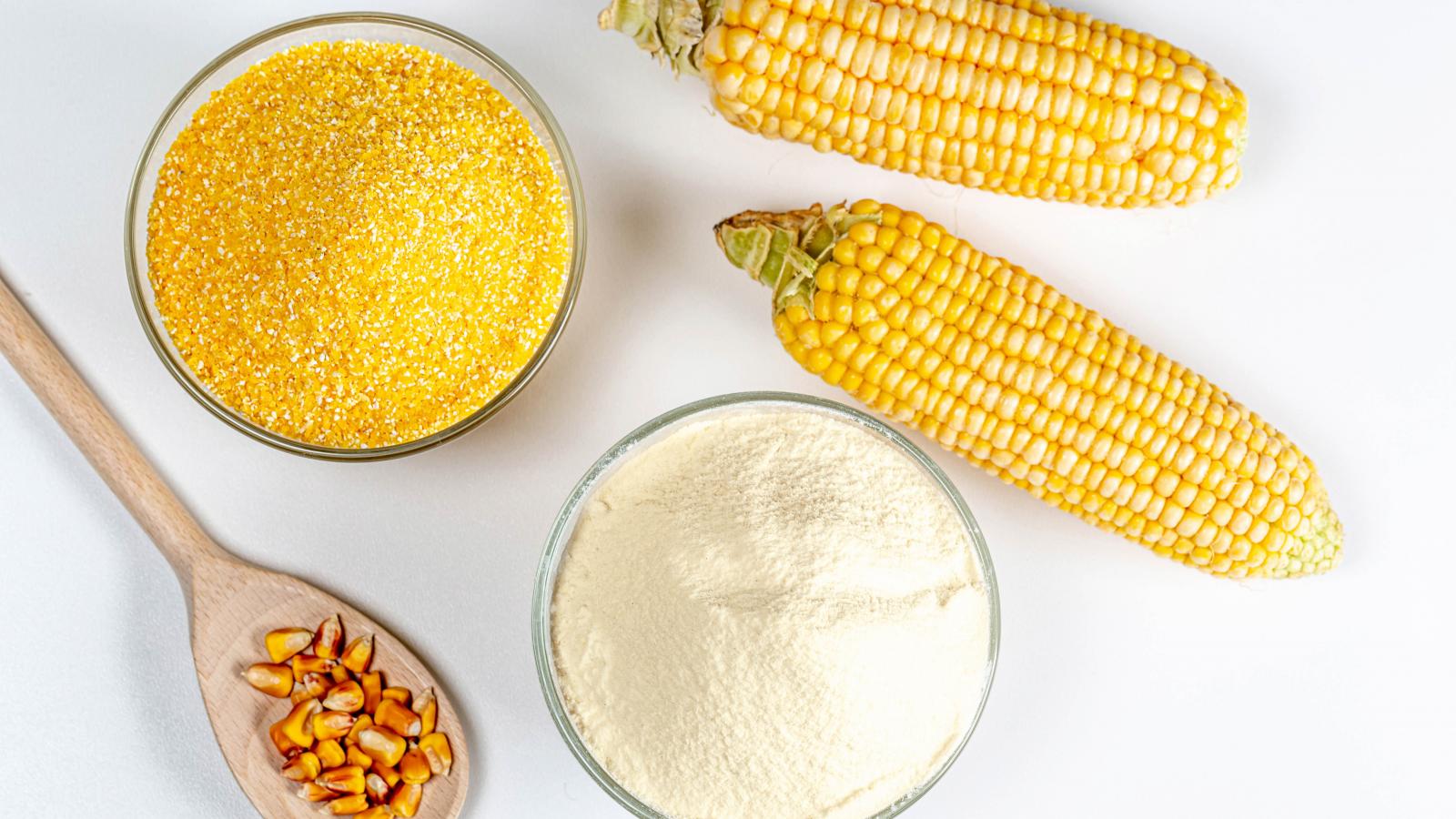 Обои Два початка кукурузы на белом фоне с крупой и мукой