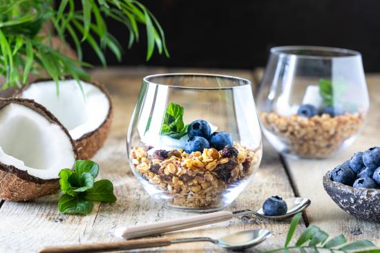 Обои Мюсли с ягодами черники на столе с кокосом