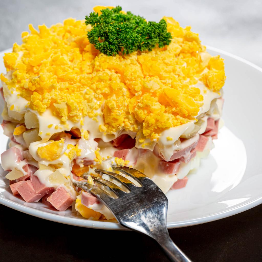 Обои Вкусный салат на белой тарелке с вилкой