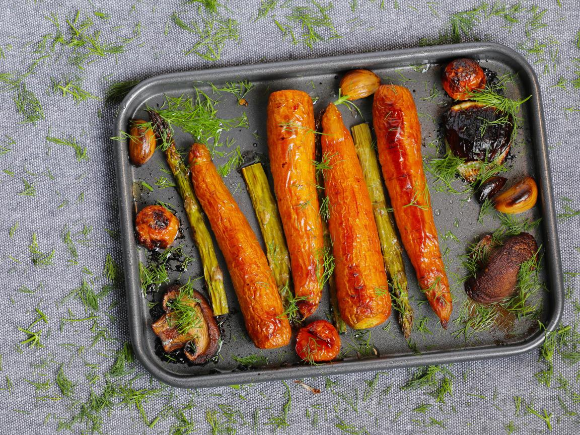 Обои Запеченная морковь со спаржей и грибами на противне