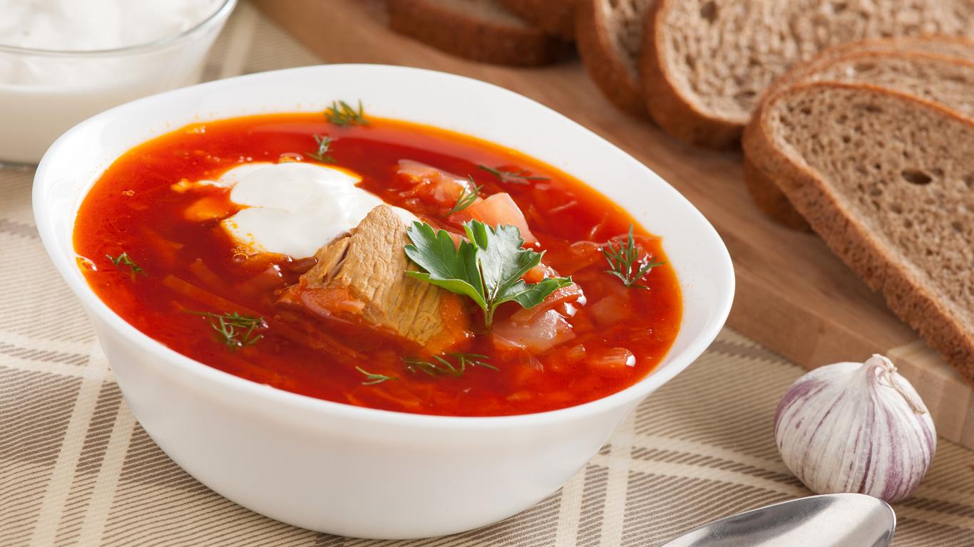Обои Тарелка горячего борща на столе с хлебом и чесноком