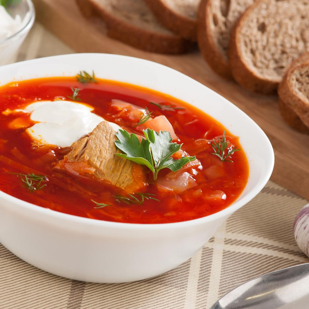 Обои Тарелка горячего борща на столе с хлебом и чесноком