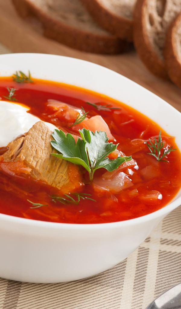 Обои Тарелка горячего борща на столе с хлебом и чесноком