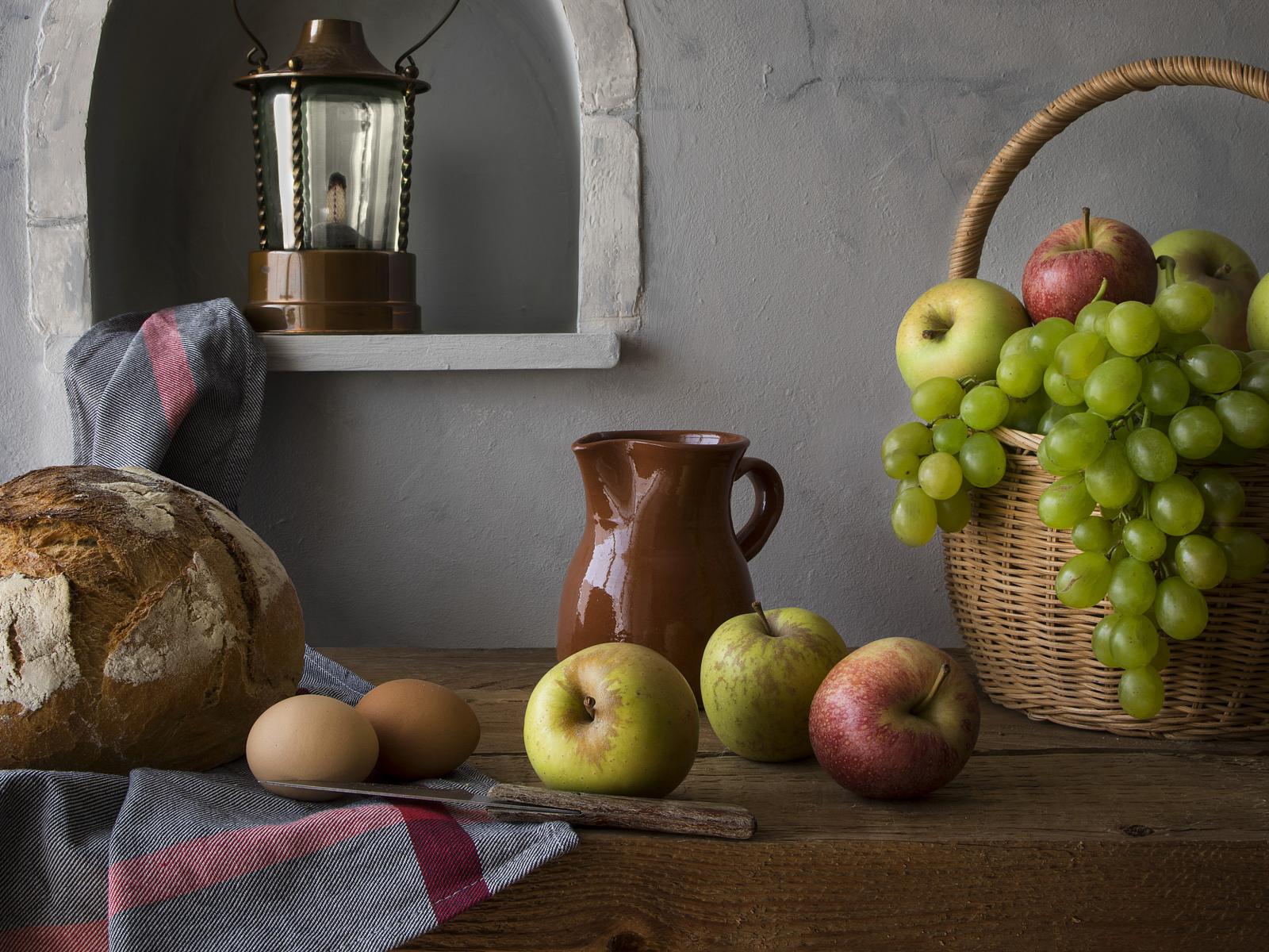 Обои Корзина с яблоками и виноградом на столе с хлебом и яйцами