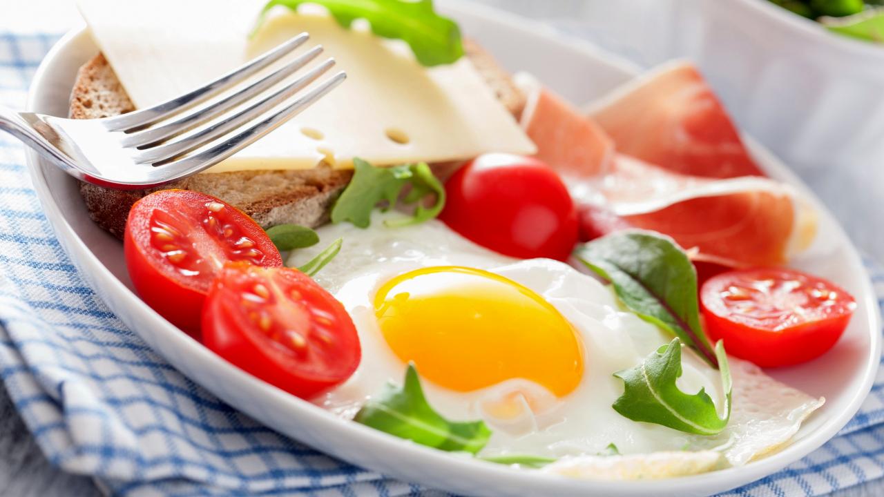 Обои Яичница с помидорами на тарелке с ветчиной и бутербродом