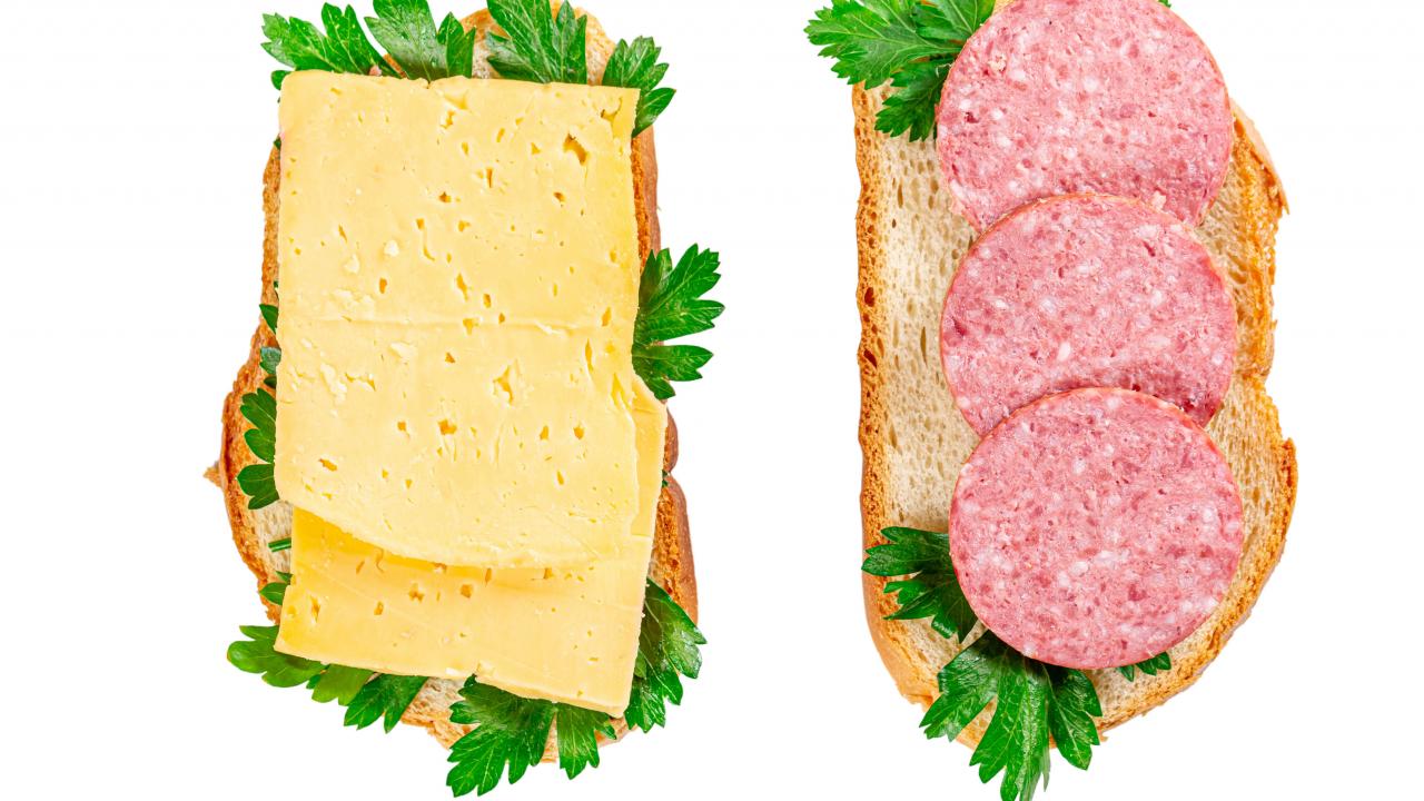Обои Два бутерброда с сыром,колбасой,петрушкой на белом фоне