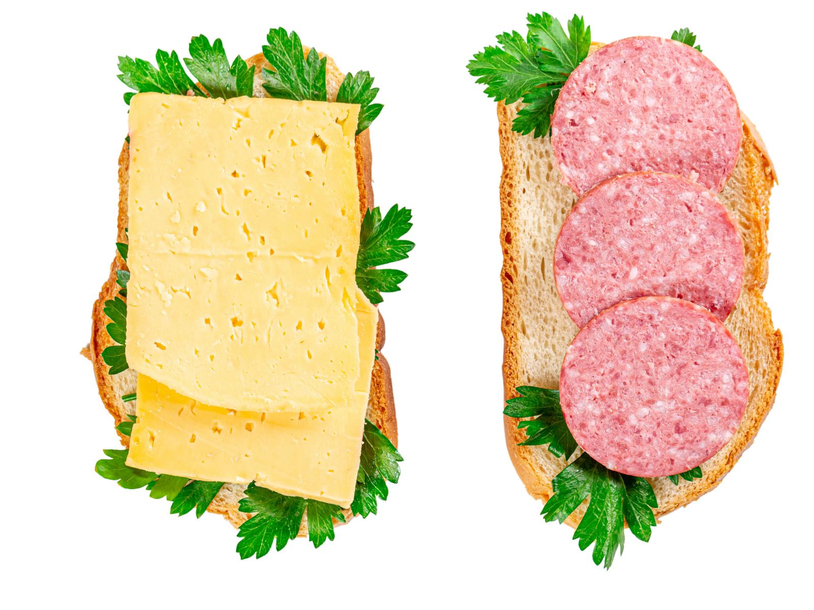 Обои Два бутерброда с сыром,колбасой,петрушкой на белом фоне