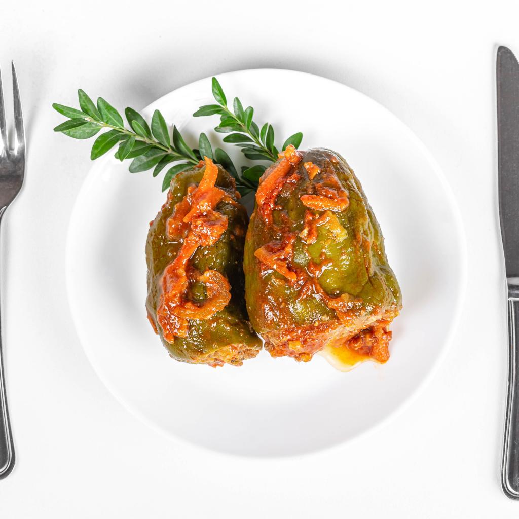 Обои Фаршированный перец на белой тарелке со столовыми приборами