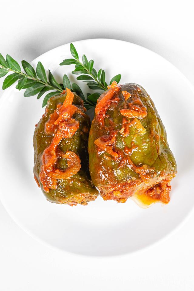 Обои Фаршированный перец на белой тарелке со столовыми приборами