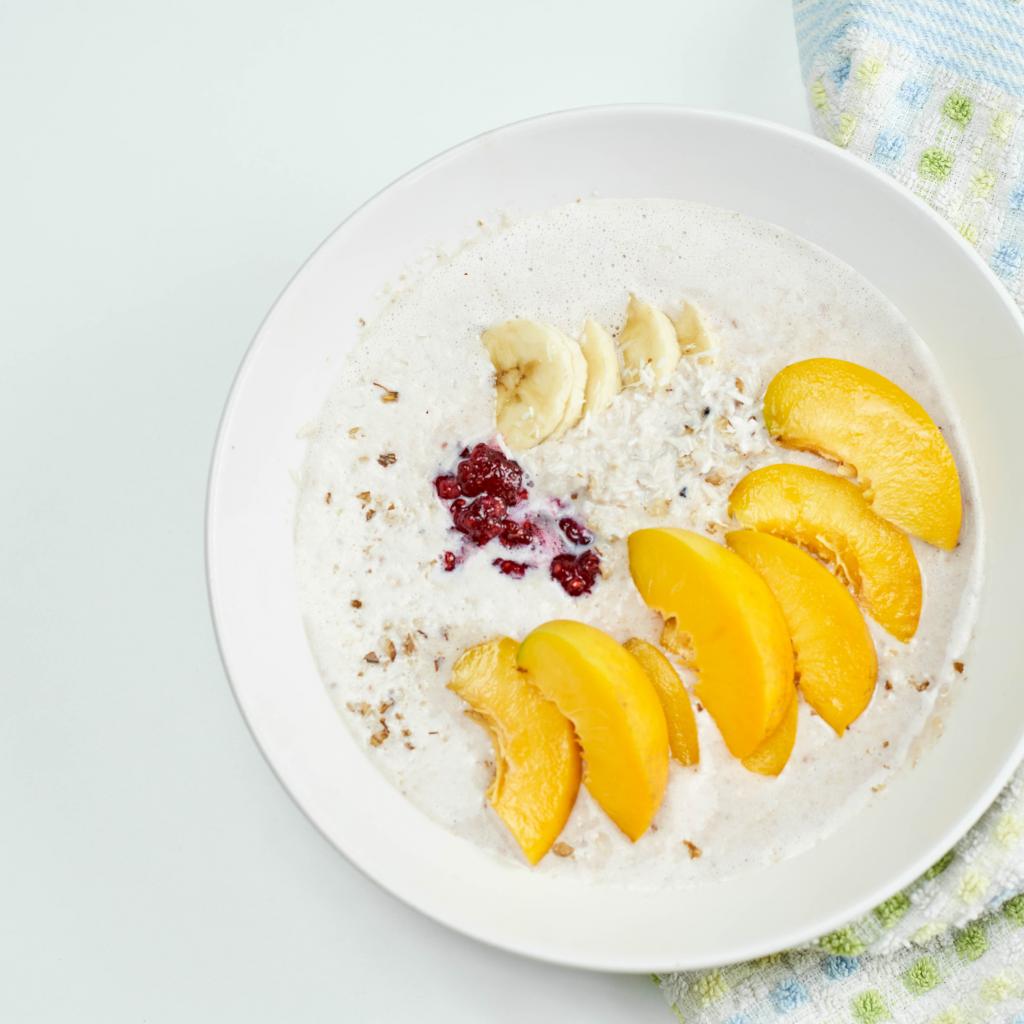 Обои Мюсли с йогуртом в тарелке с кусочками банана и персика