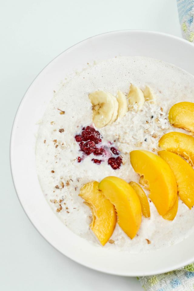 Обои Мюсли с йогуртом в тарелке с кусочками банана и персика