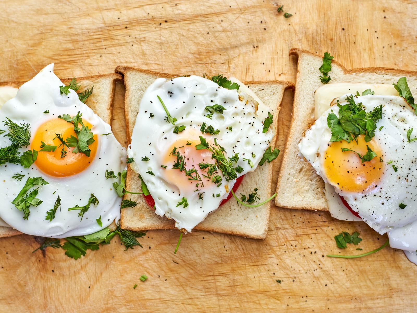 Обои Бутерброды с яичницей, помидорами и зеленью